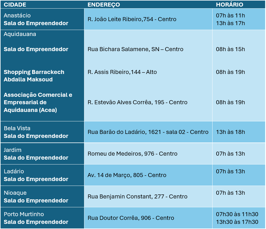 O Cidade Empreendedora é um programa executado pelo Sebrae/MS, em parceria com o Governo do Estado, por meio da Secretaria de Estado de Meio Ambiente, Desenvolvimento, Ciência, Tecnologia e Inovação (Semadesc), e com as administrações municipais de 36 cidades. Recebem o mutirão os municípios de Anastácio, Aquidauana, Bela Vista, Jardim, Ladário, Nioaque e Porto Murtinho, alcançando aproximadamente 6,7 mil MEIs ativos nessas localidades.