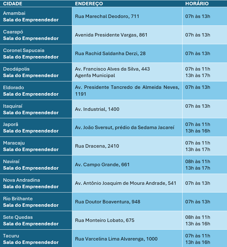 O Cidade Empreendedora é um programa executado pelo Sebrae/MS, em parceria com o Governo do Estado, por meio da Secretaria de Estado de Meio Ambiente, Desenvolvimento, Ciência, Tecnologia e Inovação (Semadesc), e com as administrações municipais de 36 cidades no estado. Na região Sul, recebem o mutirão os municípios de Amambai, Caarapó, Coronel Sapucaia, Deodápolis, Eldorado, Itaquiraí, Japorã, Maracaju, Naviraí, Nova Andradina, Rio Brilhante, Sete Quedas e Tacuru, alcançando pouco mais de 15 mil MEIs ativos nessas localidades.