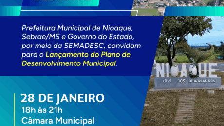 No dia 28 de janeiro, das 18h às 21h, será lançado o Plano de Desenvolvimento Municipal (PDM) de Nioaque. A iniciativa é realizada pelo Sebrae/MS, em parceria com o Governo do Estado, por meio da Secretaria de Estado de Meio Ambiente, Desenvolvimento, Ciência, Tecnologia e Inovação (Semadesc), e Prefeitura de Nioaque. O evento integra as