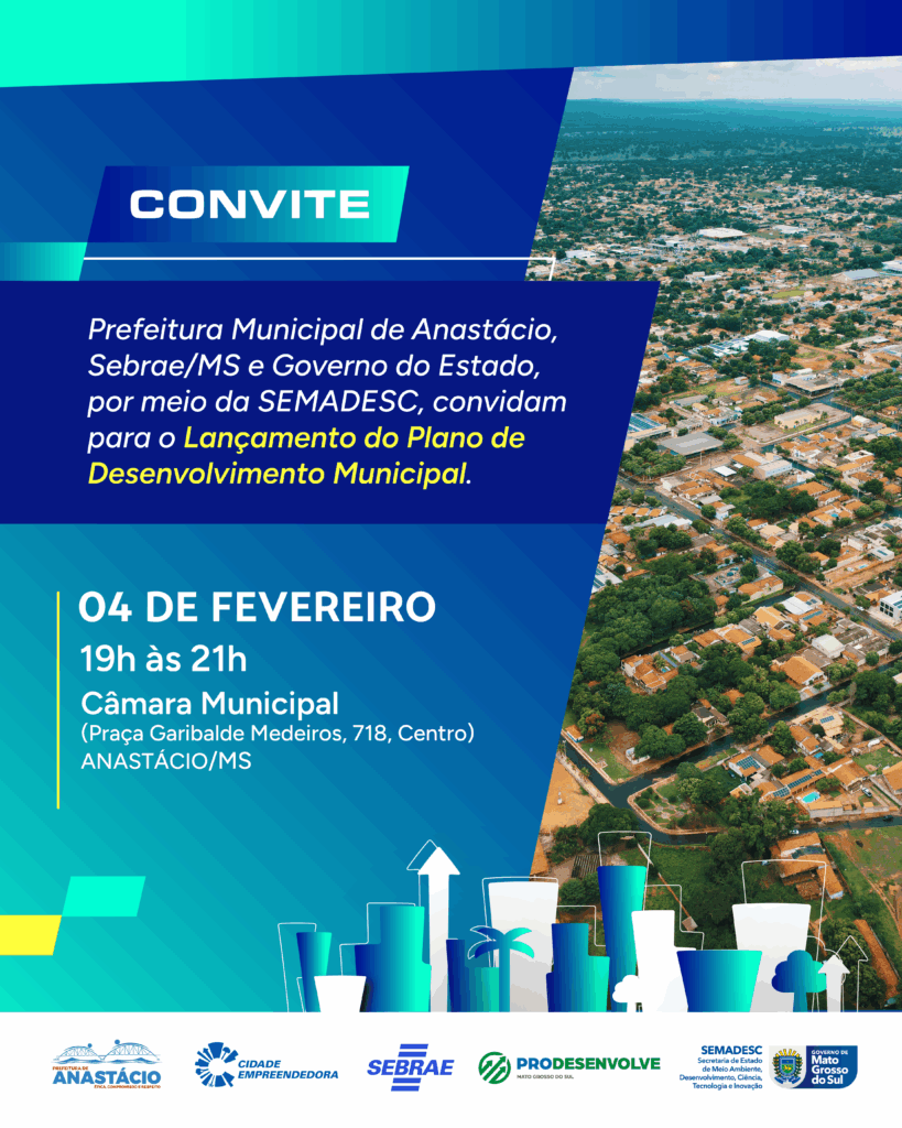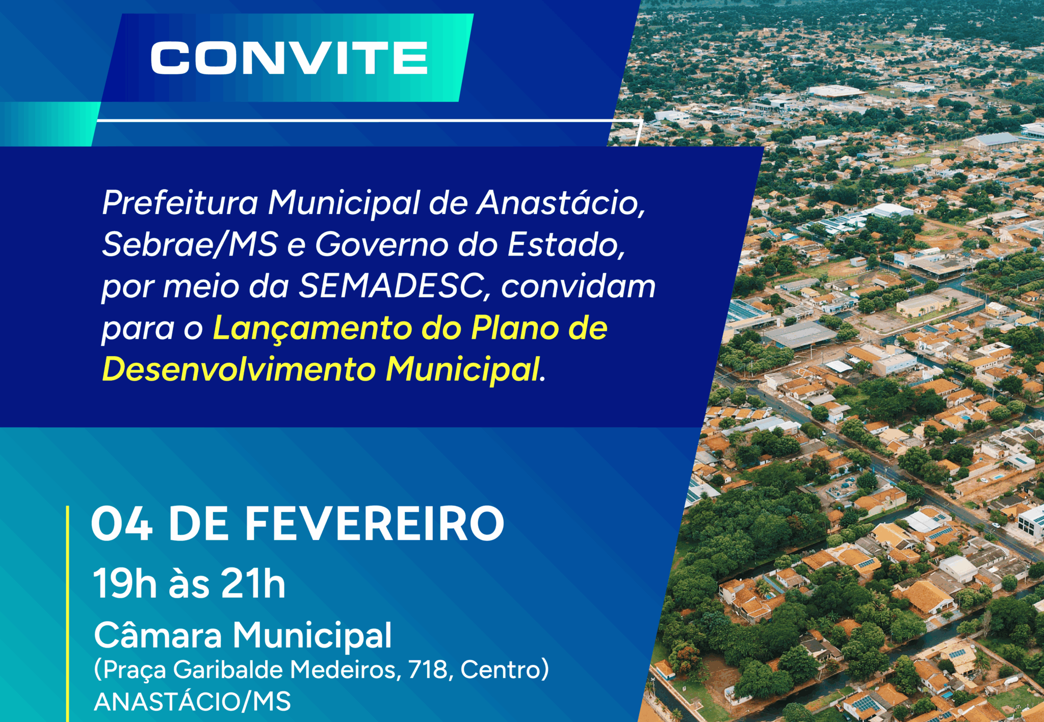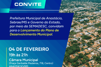 No dia 4 de fevereiro, às 19h, será lançado o Plano de Desenvolvimento Municipal (PDM) Anastácio. A iniciativa é realizada pelo Sebrae/MS, em parceria com o Governo do Estado, por meio da Secretaria de Estado de Meio Ambiente, Desenvolvimento, Ciência, Tecnologia e Inovação (Semadesc), e Prefeitura Municipal. O evento integra as ações do programa Cidade Empreendedora, desenvolvido no município em uma parceria entre as instituições, e será realizado na Câmara Municipal, localizada na Praça Garibaldi Medeiros, nº 718.