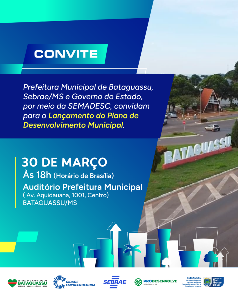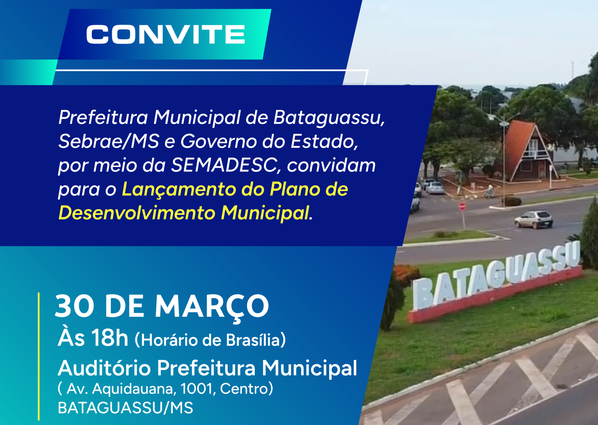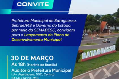 No dia 30 de março, às 18h (horário de Brasília), será lançado o Plano de Desenvolvimento Municipal (PDM) de Bataguassu. A iniciativa é realizada pelo Sebrae/MS, em parceria com o Governo do Estado, por meio da Secretaria de Estado de Meio Ambiente, Desenvolvimento, Ciência, Tecnologia e Inovação (Semadesc), e administração municipal. O evento integra as ações do programa Cidade Empreendedora, desenvolvido no município em uma parceria entre as instituições, e será realizado no auditório da Prefeitura, localizado na avenida Aquidauana, 1001, centro.