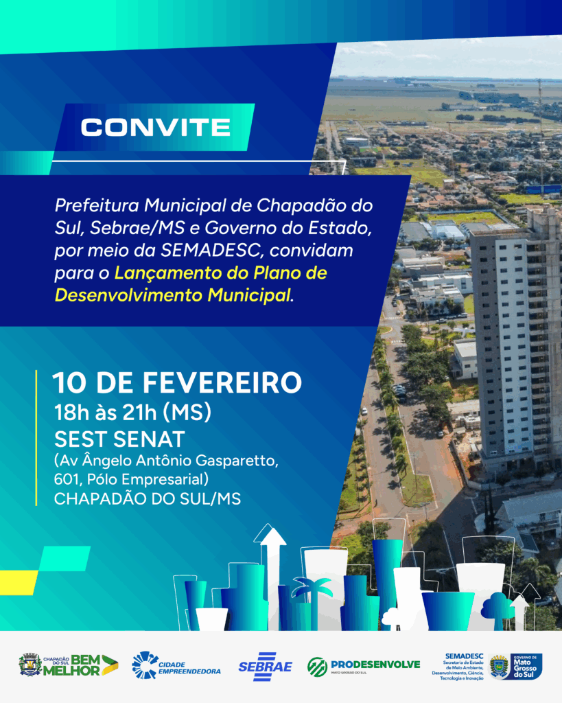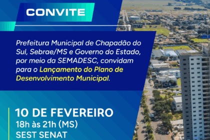 No dia 10 de fevereiro, das 18h às 21h (MS), será lançado o Plano de Desenvolvimento Municipal (PDM) de Chapadão do Sul. A iniciativa é realizada pelo Sebrae/MS, em parceria com o Governo do Estado, por meio da Secretaria de Estado de Meio Ambiente, Desenvolvimento, Ciência, Tecnologia e Inovação (Semadesc), e Prefeitura Municipal. O evento integra as ações do programa Cidade Empreendedora, desenvolvido no município em uma parceria entre as instituições, e será realizado no Sest Senat, localizado na avenida Ângelo Gasparetto, 601, Polo Empresarial.