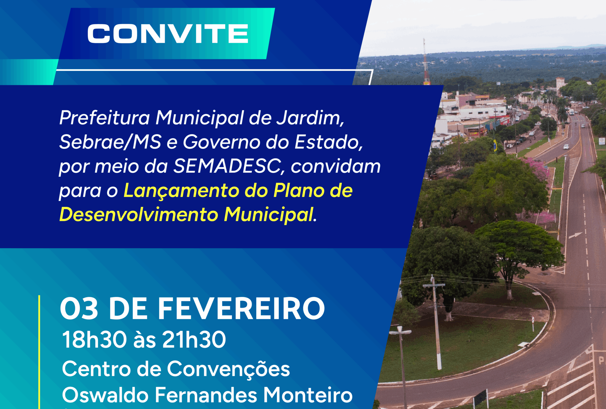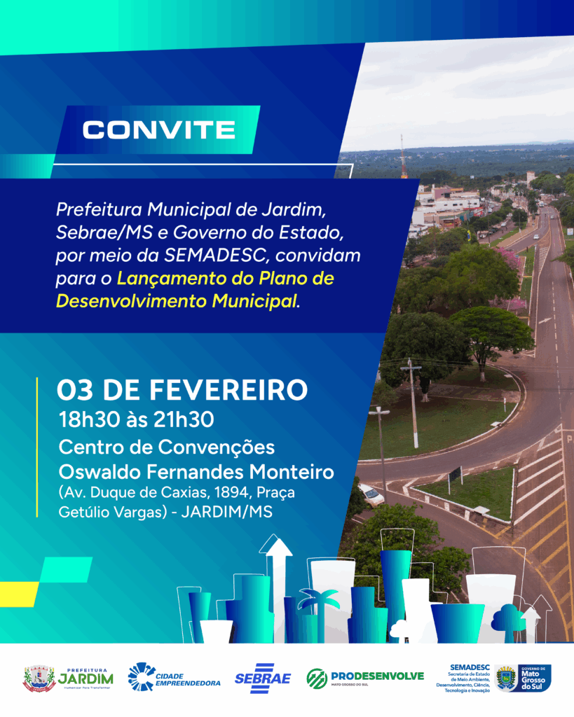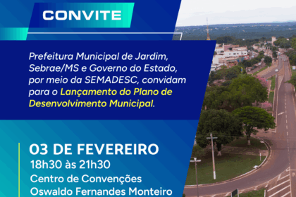 No dia 3 de fevereiro, das 18h30 às 21h30, será lançado o Plano de Desenvolvimento Municipal (PDM) de Jardim. A iniciativa é realizada pelo Sebrae/MS, em parceria com o Governo do Estado, por meio da Secretaria de Estado de Meio Ambiente, Desenvolvimento, Ciência, Tecnologia e Inovação (Semadesc), e Prefeitura de Jardim. O evento integra as ações do programa Cidade Empreendedora, desenvolvido no município em uma parceria entre as instituições, e será realizado no Centro de Convenções Oswaldo Fernandes Monteiro, localizado na avenida Duque de Caxias, nº 1894 – Praça Getúlio Vargas.