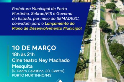 No dia 10 de março, às 18h00, será lançado o Plano de Desenvolvimento Municipal (PDM) de Porto Murtinho. A iniciativa é realizada pelo Sebrae/MS, em parceria com o Governo do Estado, por meio da Secretaria de Estado de Meio Ambiente, Desenvolvimento, Ciência, Tecnologia e Inovação (Semadesc), e Prefeitura de Porto Murtinho. O evento integra as ações do programa Cidade Empreendedora, desenvolvido no município em uma parceria entre as instituições, e será realizado no Cine Teatro Ney Machado Mesquita, localizado na rua Pedro Celestino, 20.